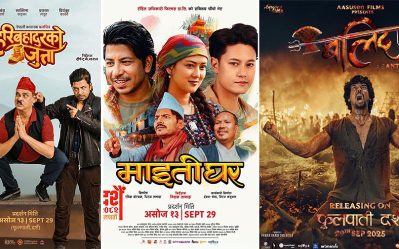 काठमाडौँ, २२ असोज । असोज १३ गते दशैँमा प्रदर्शनमा आएका तीन चलचित्र ‘बलिदान’, ‘माइतीघर’ र ‘हरिबहादुरको जुत्ता’ को पछिल्लो बक्स अफिस रिपोर्ट सार्वजनिक भएको छ । चलचित्र विकास बोर्डले तीनवटै फिल्मको आठ दिनको ग्रस कमाई बुधबार सार्वजनिक गरेको हो ।